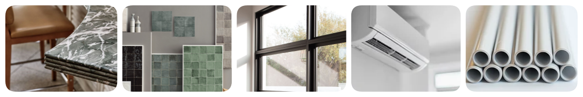 建筑內部和飾面:陶瓷和瓷磚、涂料、密封劑和粘合劑、地板、天花板、墻壁其他室內飾面、室內建筑照明、廚房、浴室和衛生潔具等;